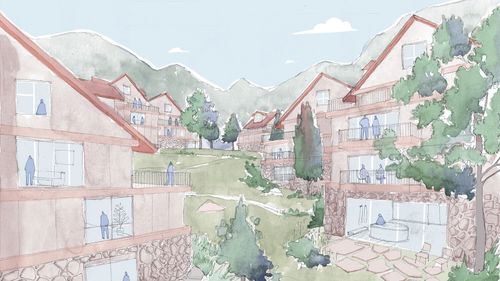 In a second iteration of the study of this plotin Wildhaus, Switzerland, the potential for residential use was explored. The proposal comprises 60 apartments with 1 to 3 bedrooms, distributed in 6 identical buildings. The volumes are positioned in such a way as to create varied outdoor spaces and provide all apartments with excellent views.